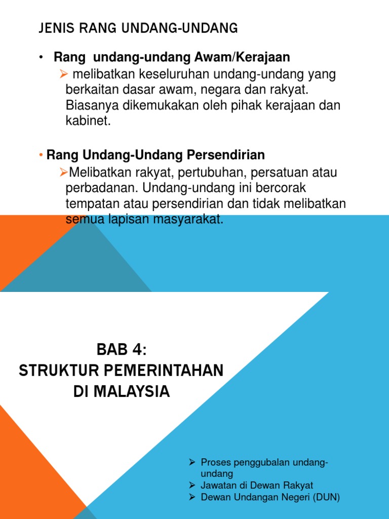 Jenis undang-undang Terdapat 4 jenis rang undang-undang di Malaysia a. YB Dato Sri Dr. Rang II bunyi spt bunyi gendang dll.